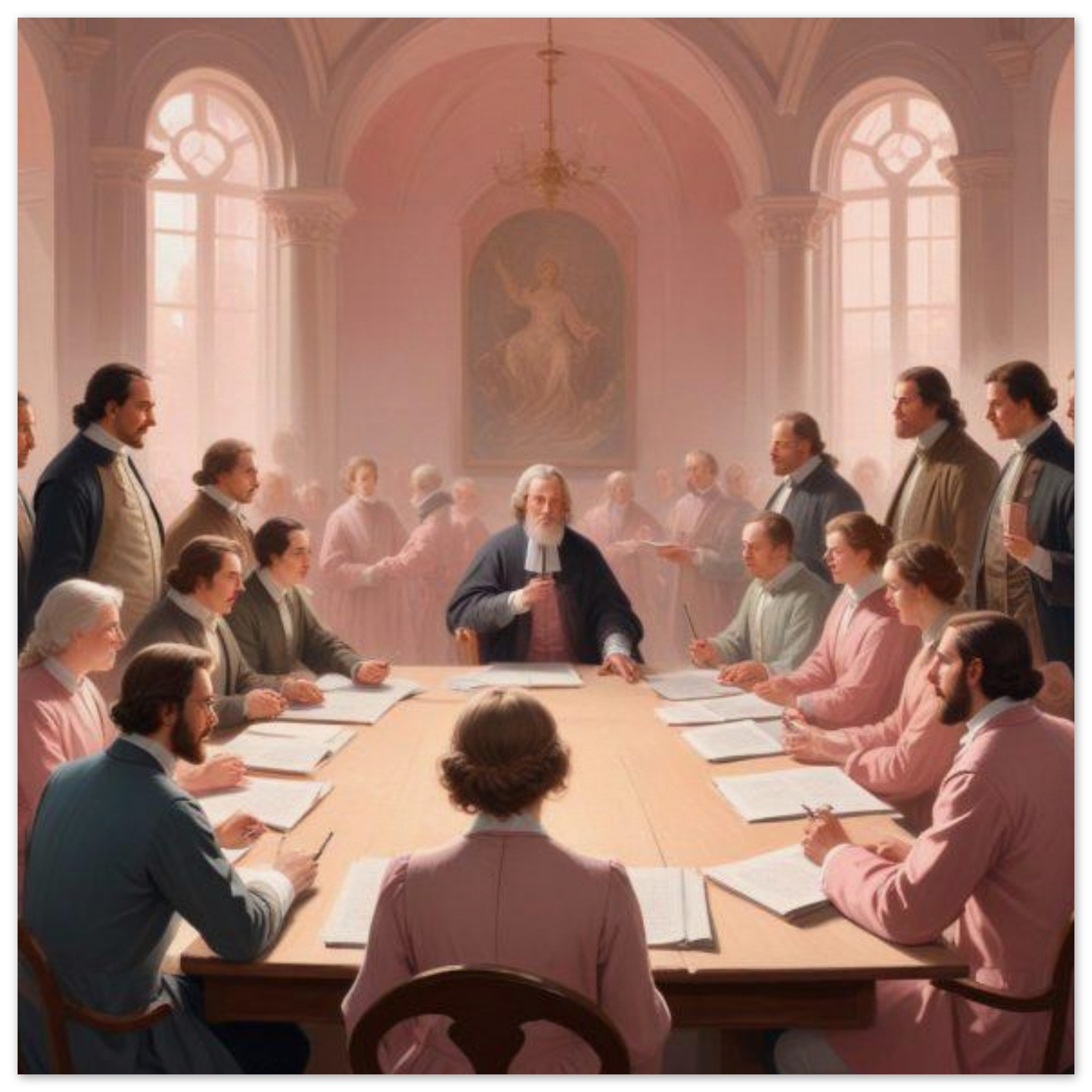 A diverse group of nine people, consisting of men and women, are gathered around a large wooden table in a room with brown walls. The individuals are wearing various types of clothing and are engaged in a meeting or discussion. The room is furnished with chairs and the table is covered with papers. The group appears focused and attentive. The scene is well-lit and the dominant colors are shades of brown. There are no identifiable faces in the image, but the overall atmosphere suggests a professional or formal setting.
