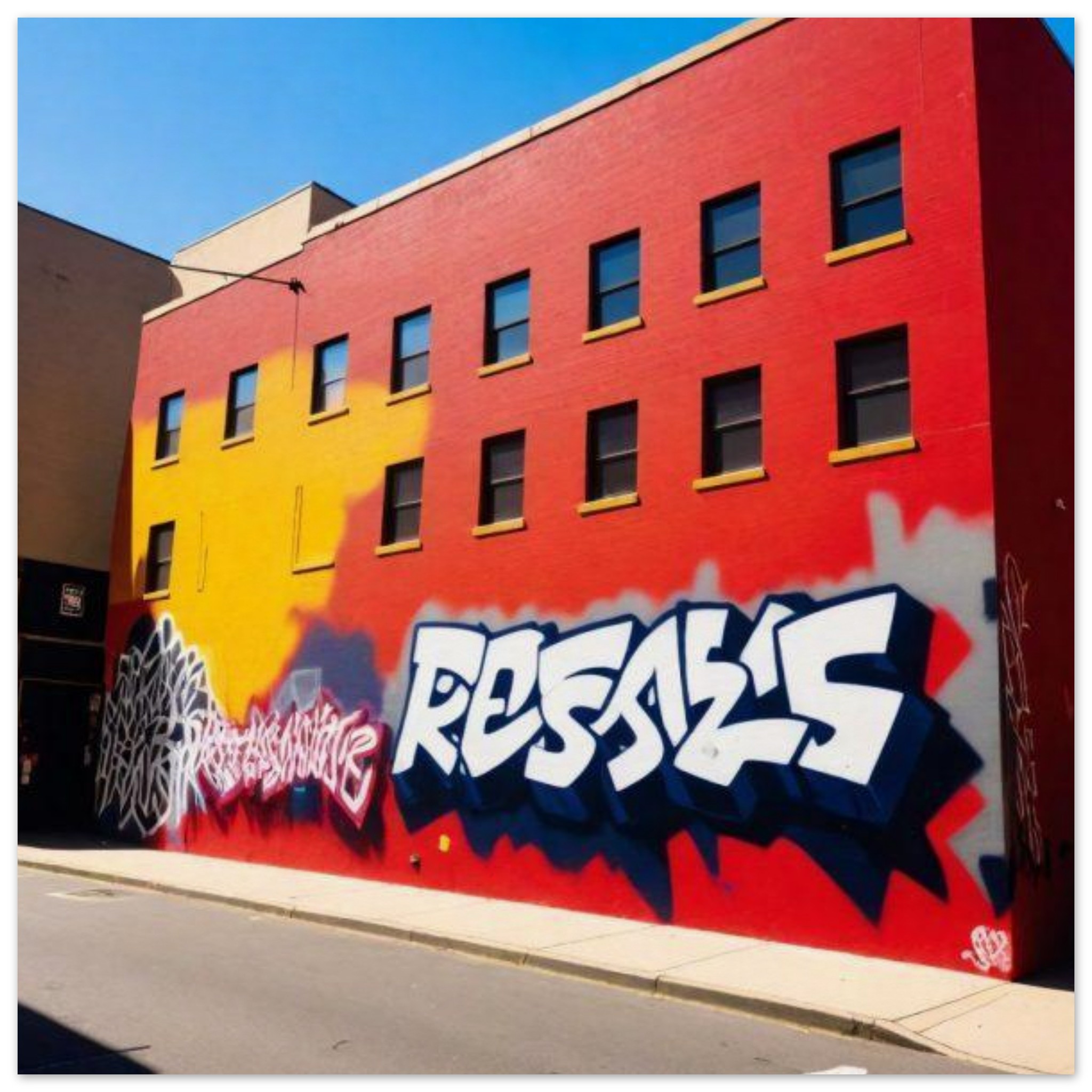 A vibrant red building with graffiti covering the side stands tall in this urban scene. The graffiti features a mix of colors, adding an artistic touch to the otherwise plain wall. The building has several windows, with red frames that contrast with the colorful artwork. The sky above is a clear blue, providing a beautiful backdrop for the street art. The overall image captures the essence of street art culture, with the building serving as a canvas for creative expression in a bustling city setting.
